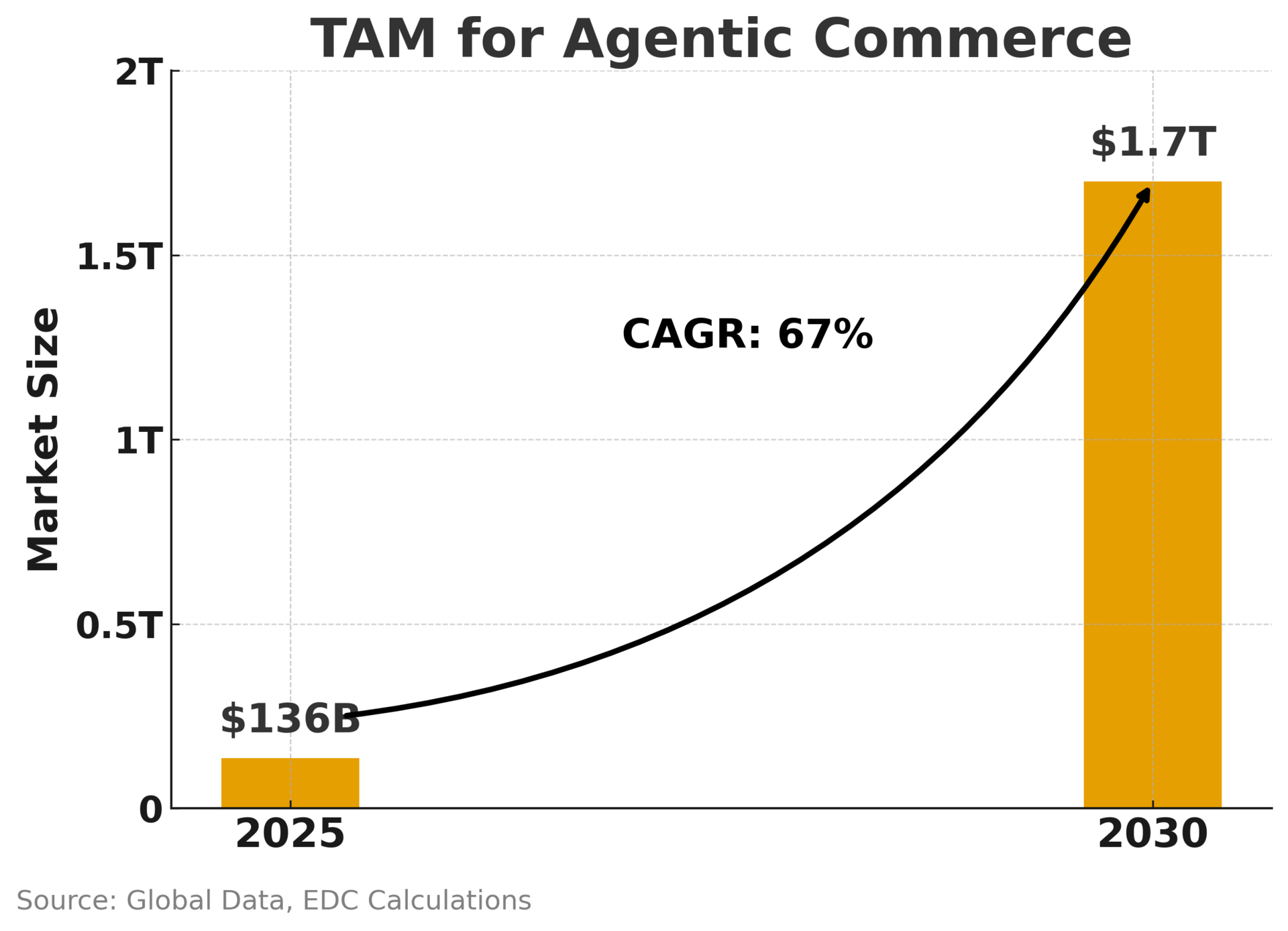 OpenAI announced its Instant Checkout and Agentic Commerce Protocol on September 29, 2025, with U.S. rollout to begin in November. Users will be able to buy products directly through ChatGPT via Etsy, with Shopify integration next. That announcement sent Etsy stock up 16% and Shopify up 6%, after both companies were confirmed as launch partners for the new shopping tools. Consultancy Edgar, Dunn & Co. projects $136B in agent-initiated transactions in 2025, rising to $1.7T by 2030, a figure that would rival today’s global retail media market.