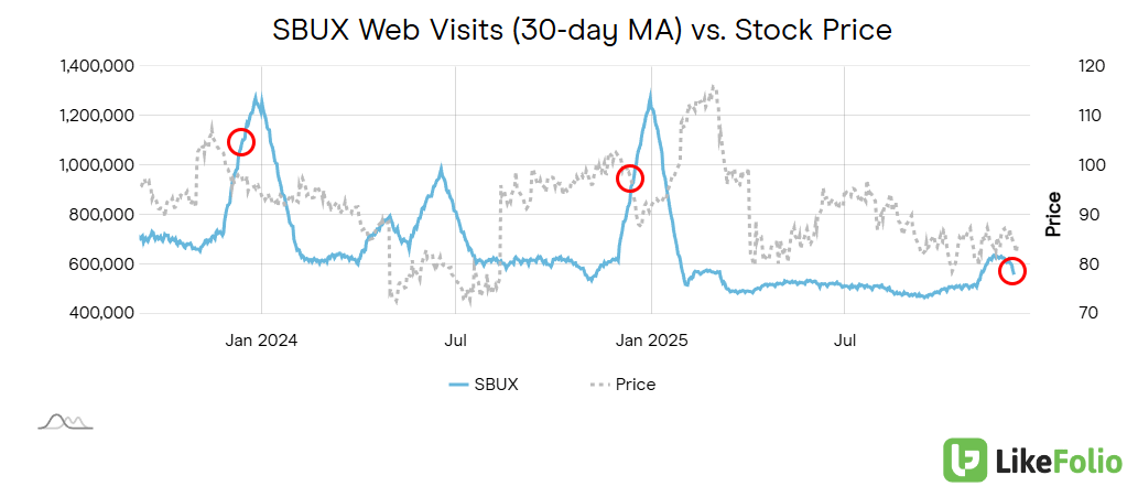 Our data for the current holiday season shows SBUX facing the most abysmal demand we have ever tracked for them during this critical period. Starbucks is barely registering on demand charts, a shocking low given the time of year.