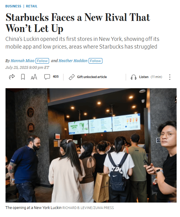 Take Luckin Coffee (China’s answer to the coffee giant), which just opened its first stores in NYC, adding a formidable global competitor right into Starbucks’ home court. As reported in the Wall Street Journal earlier this year, Luckin is focused on aggressively low pricing and speed, an existential threat to Starbucks' high-priced, high-friction model.