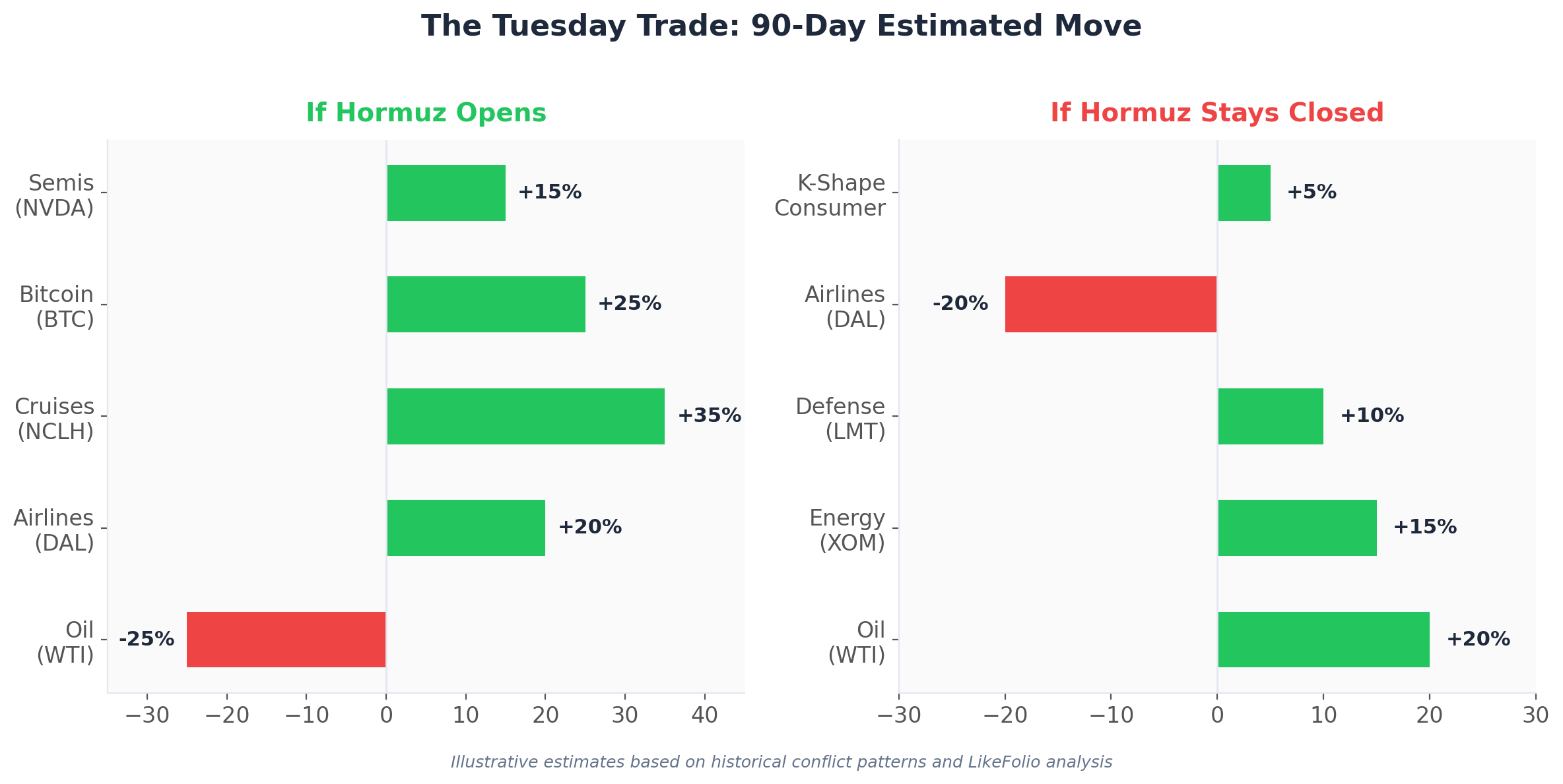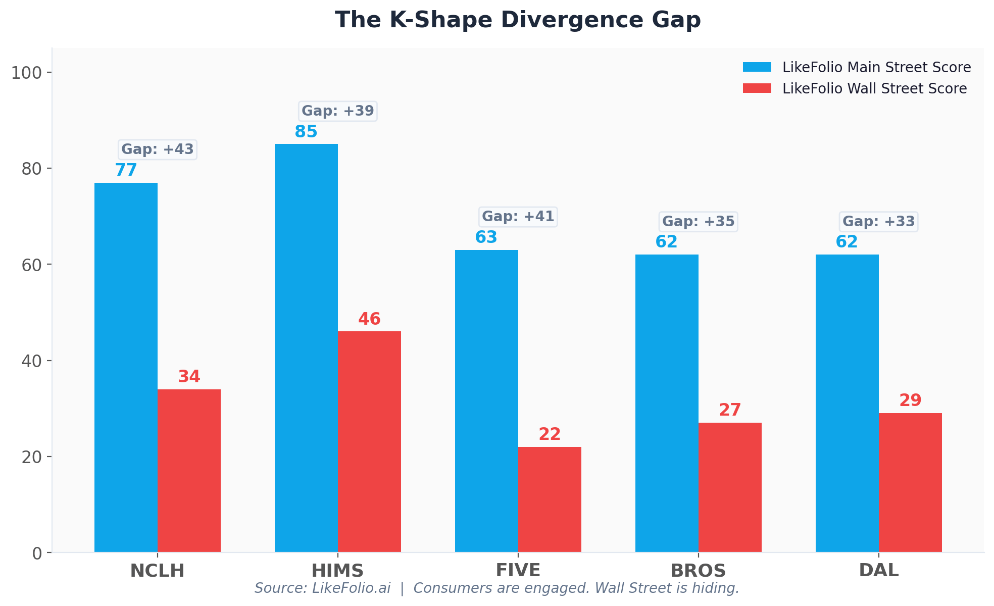 Airlines snap back first. Delta (DAL) is down hard on fuel costs... but LikeFolio's consumer demand data tells a different story. DAL carries a LikeFolio Main Street Score of 62 vs. a LikeFolio Wall Street Score of just 29. Consumers are still booking flights. Wall Street is scared of jet fuel. When that fear lifts, the Divergence Gap closes fast.